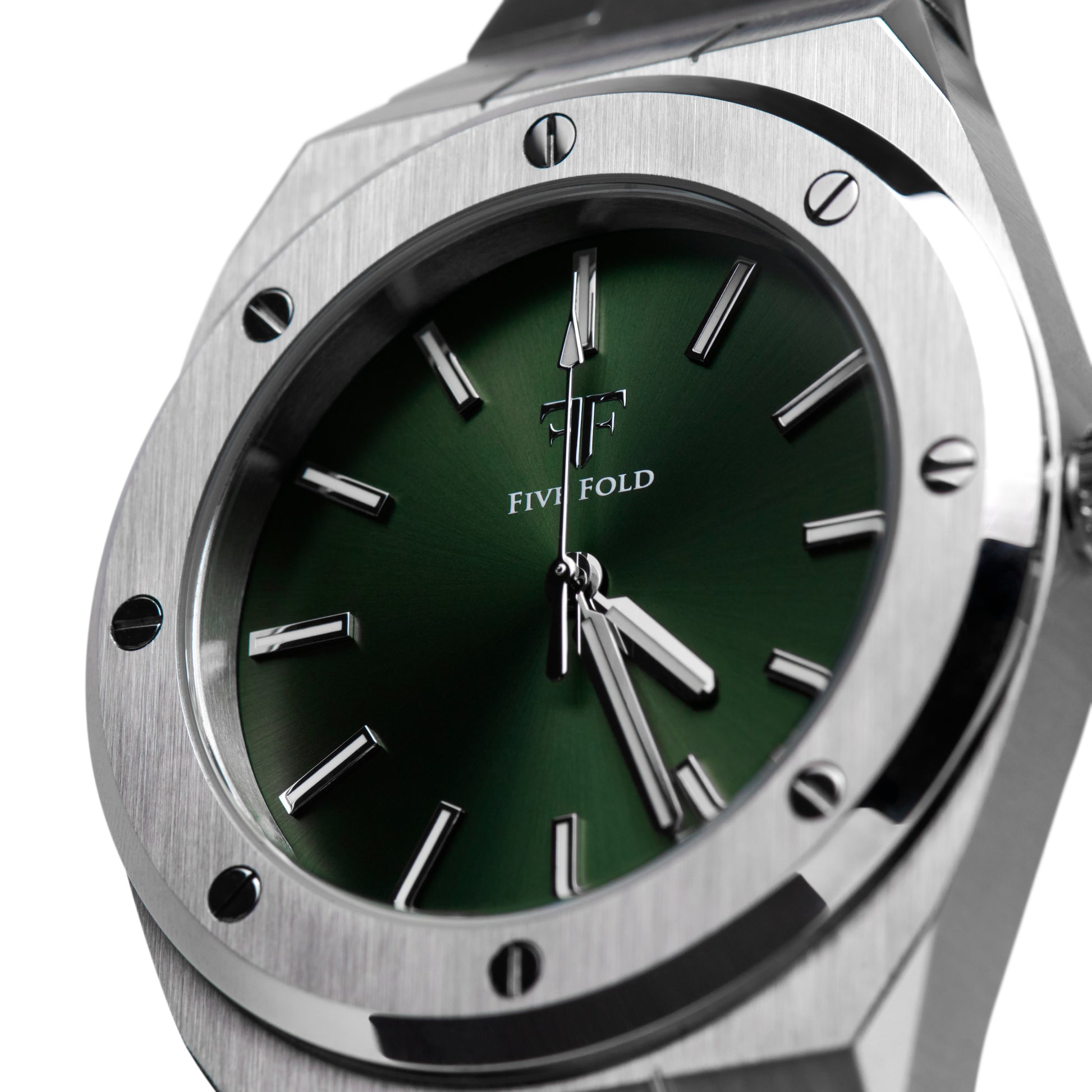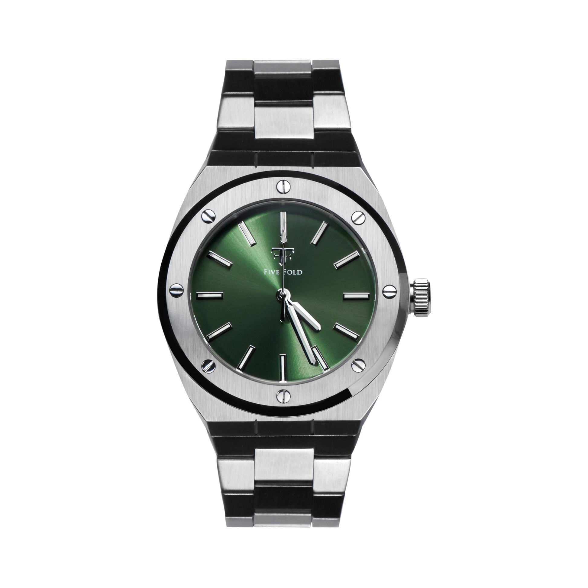 Designed to make a statement with refined strength, the Forza features a bold green dial set into a durable stainless steel case and bracelet. With a 42 mm profile and removable links for a tailored fit, it balances presence with comfort. Built for daily wear, Forza brings eye-catching elegance and dependable craftsmanship to your wrist.